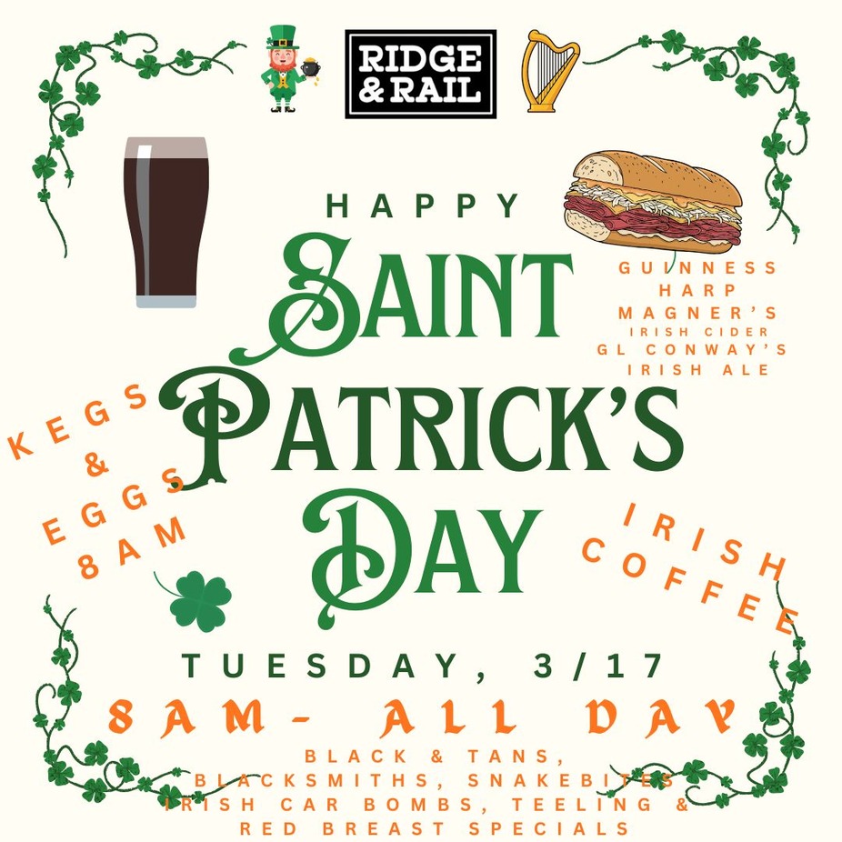 WE WILL HAVE GUINNESS, HARP, MAGNER'S IRISH CIDER, AND GREAT LAKES CONWAY'S IRISH ALE ON DRAFT AND DELICIOUS IRISH COFFEE AND IRISH THEMED COCKTAILS!!! WE'LL BE SERVING YUMMY BREAKFAST EGGS OPTIONS AND OUR VERY OWN HOUSE CORNED BEEF (BRAISED IN GUINNESS AND HARP IRISH BEERS) ALL DAY!