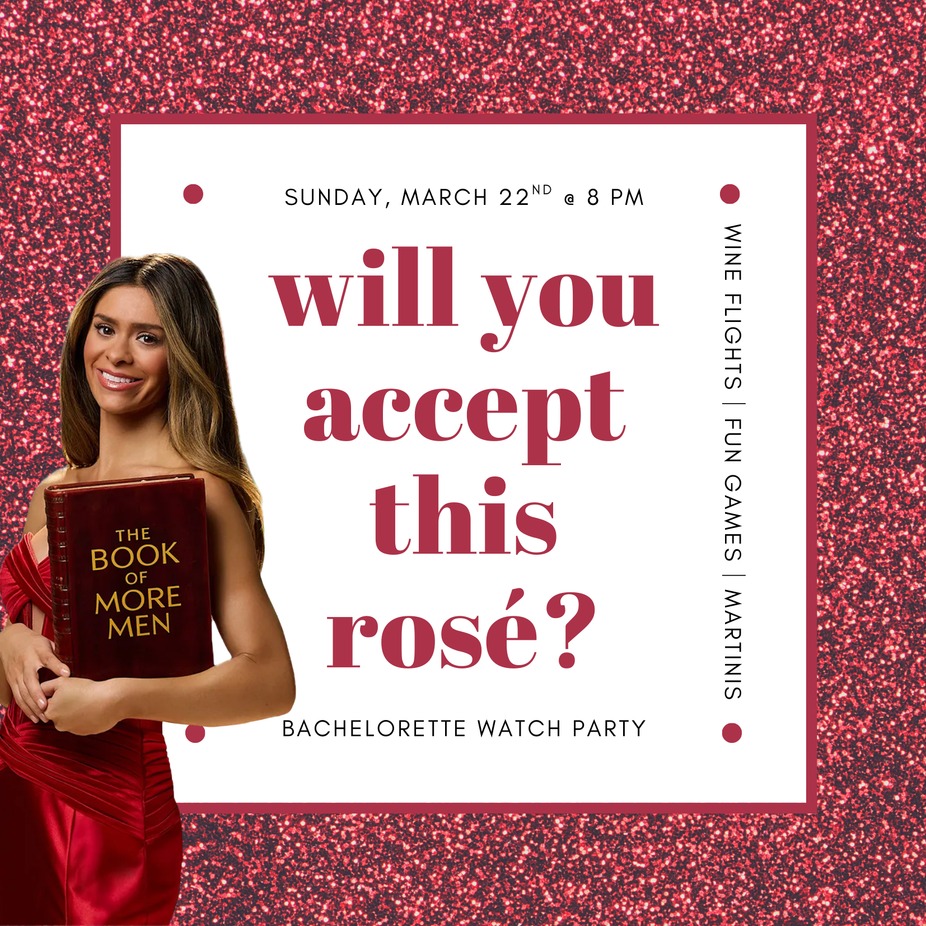 Join us for the debut of Taylor Frankie Paul's season of The Bachelorette! Your $10 ticket gets you a reserved table and an appetizer. Wine flights, specialty martinis, and fun games with prizes await!